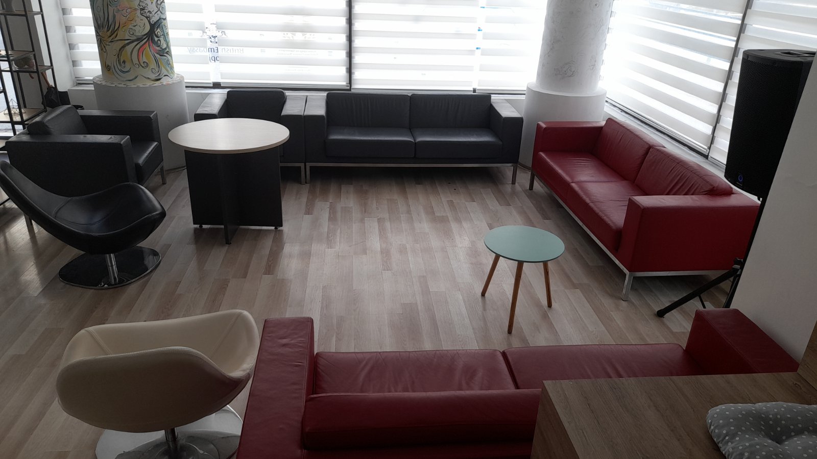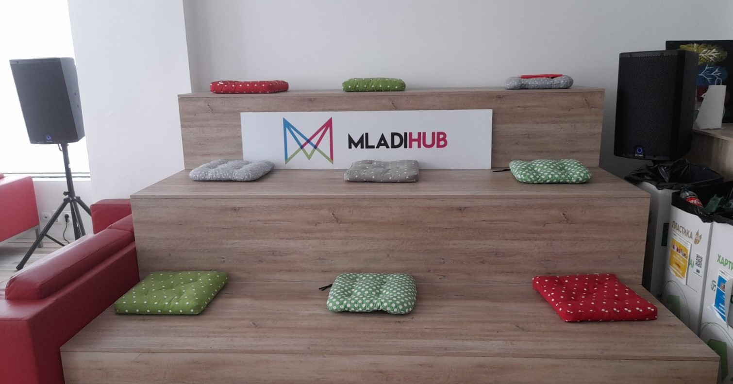 МладиХаб располага со канцелариска опрема, конференциска маса, lounge простор, место за складирање, кујна и тоалети.